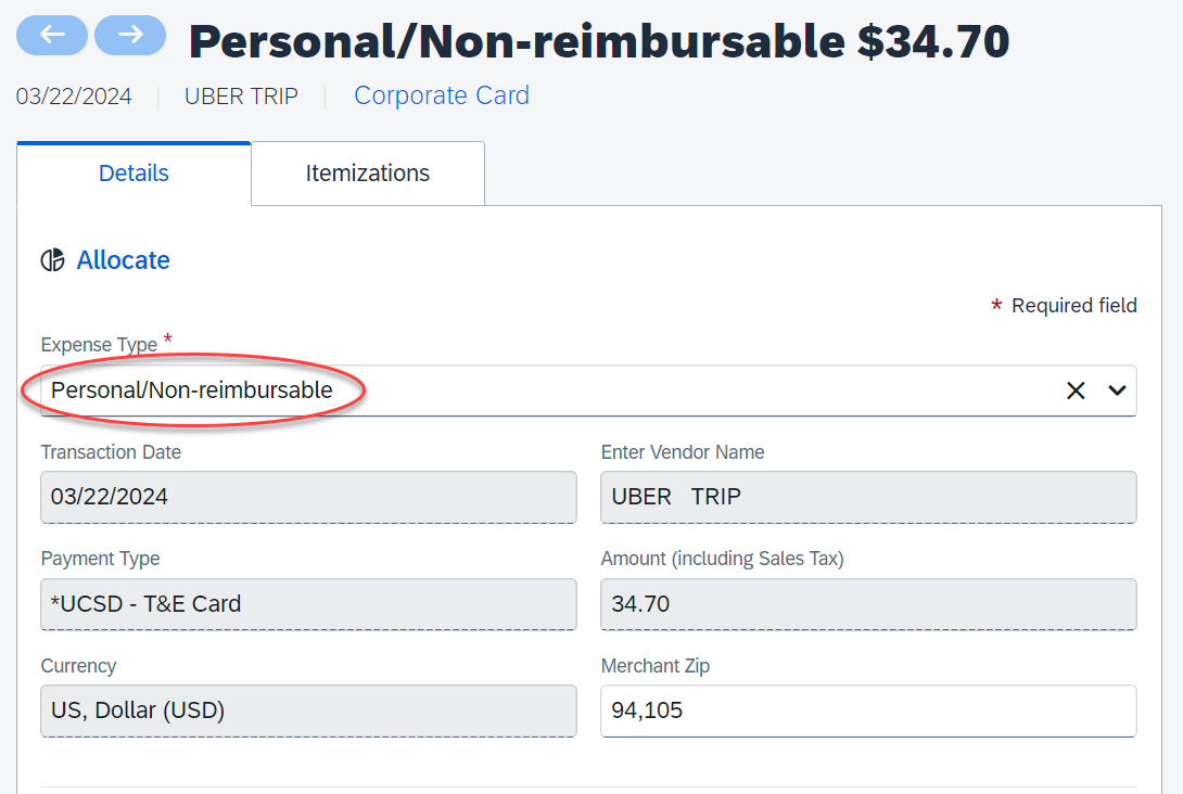 b. OR If only a partial amount of the card charge is Personal/Non-reimbursable, please use the Itemization feature to itemize the allowable expense and the personal/non-reimbursable expense.
