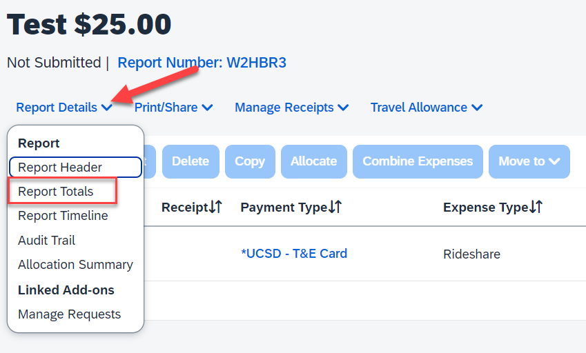 5. Select Report Details and then Report Totals to confirm that the employee must pay back the University.