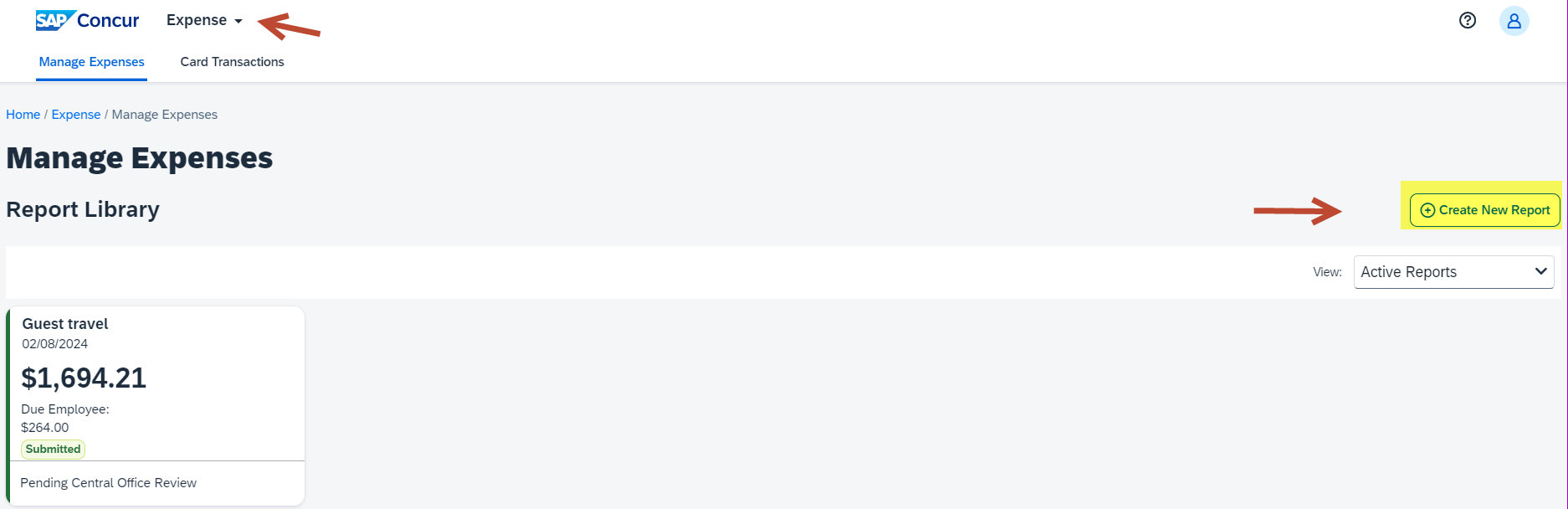 1. Select the Expense module from the top of the page, the Manage Expenses > Report Library will display.