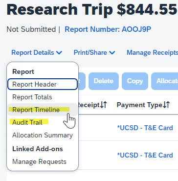 2. To view the approval flow, select Report Details drop-down menu, select Audit Trail or Report Timeline.