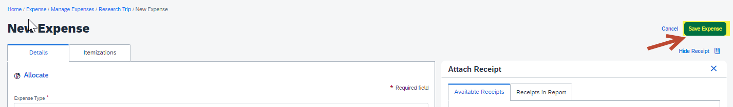 b. To distribute or split costs across different chart strings, Allocate the Expense(s) at the end before submitting the report.