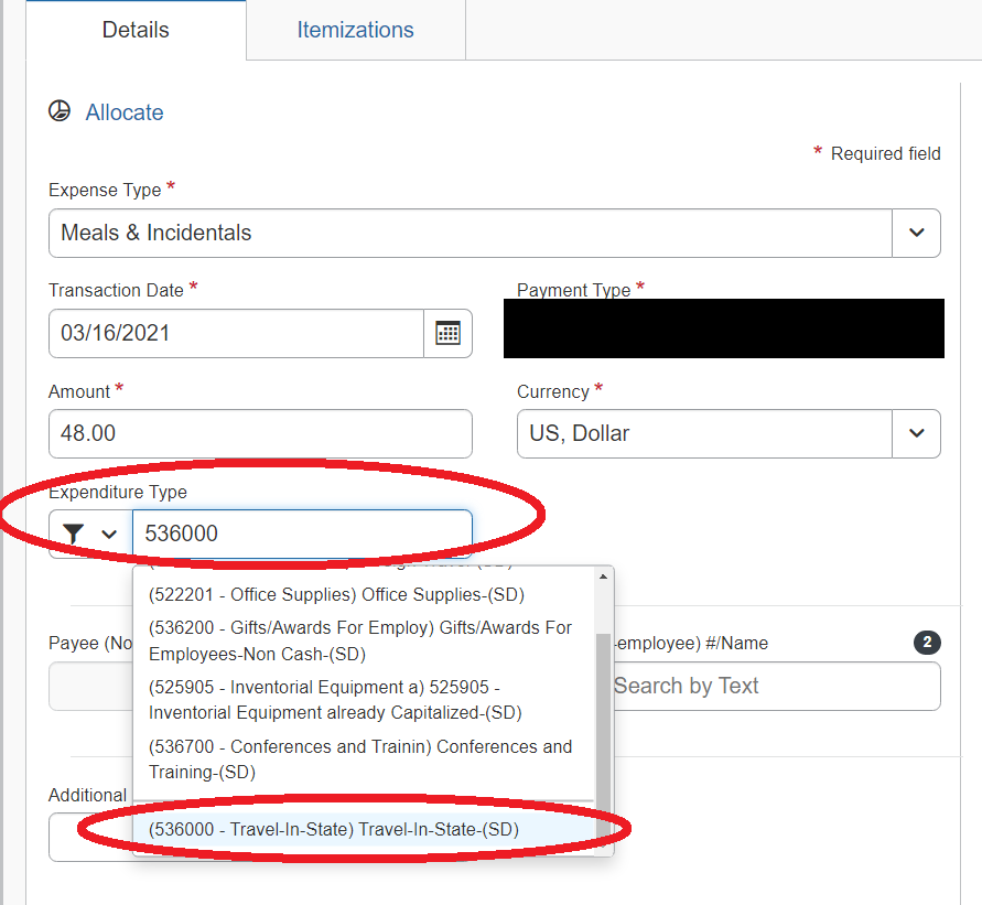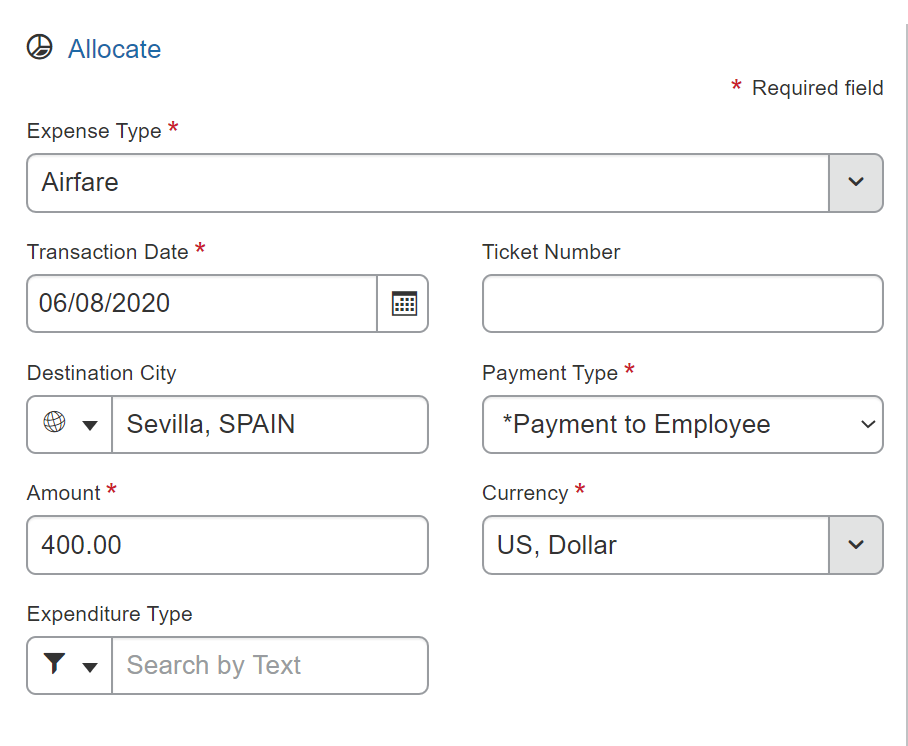6. Enter the proper Expenditure Type (depending on type of travel) where indicated: