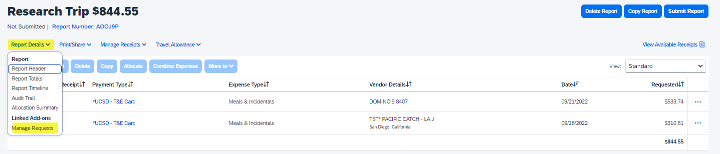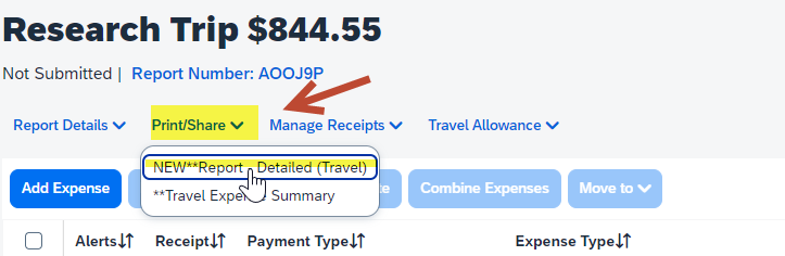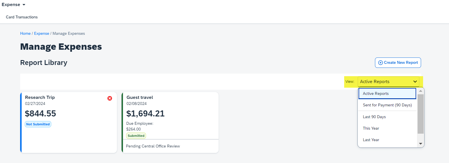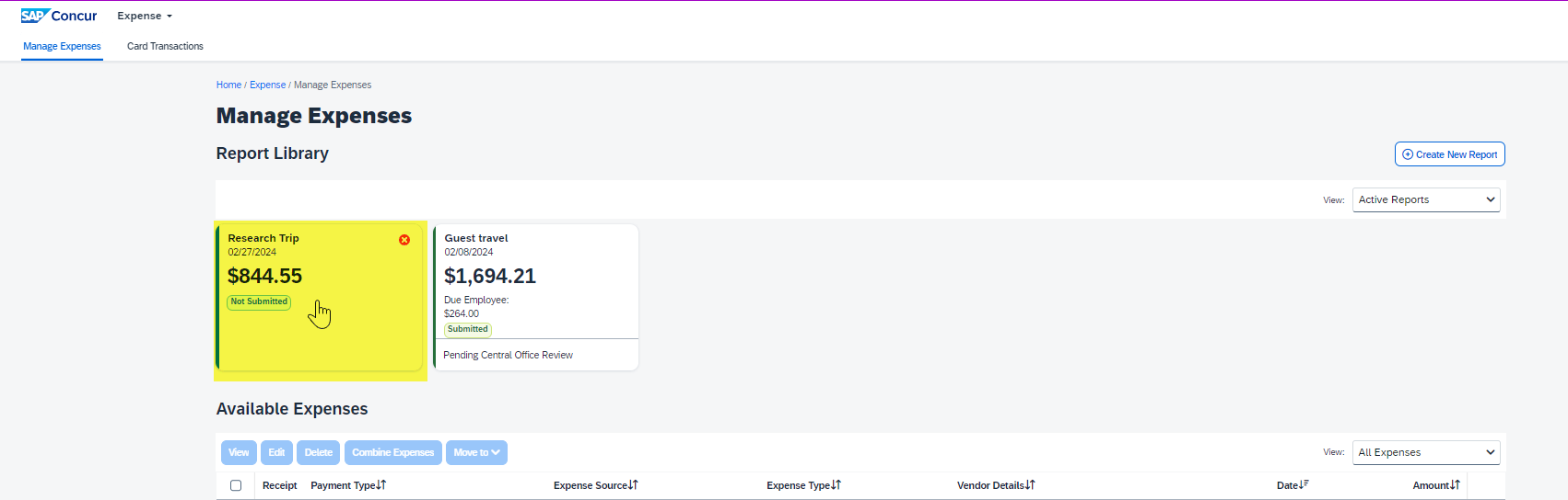 1. In the Manage Expenses > Report Library, select your report, e.g. Research Trip.