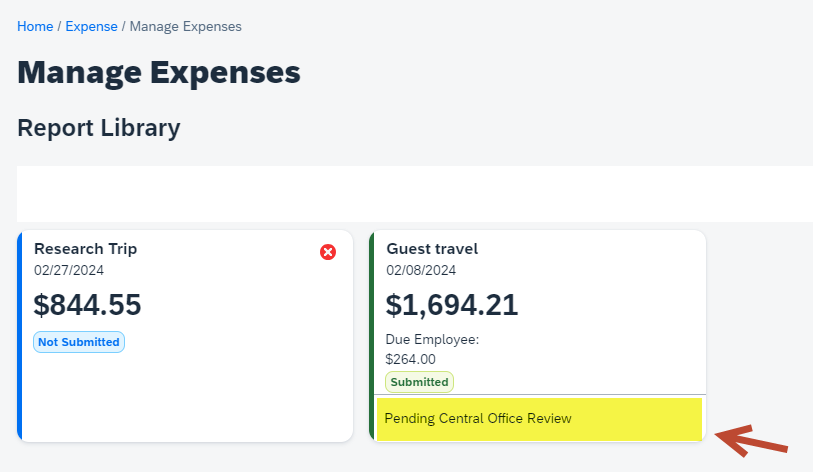 1. From Manage Expenses ---> Report Library, the status will appear on the desired Report image.