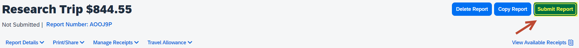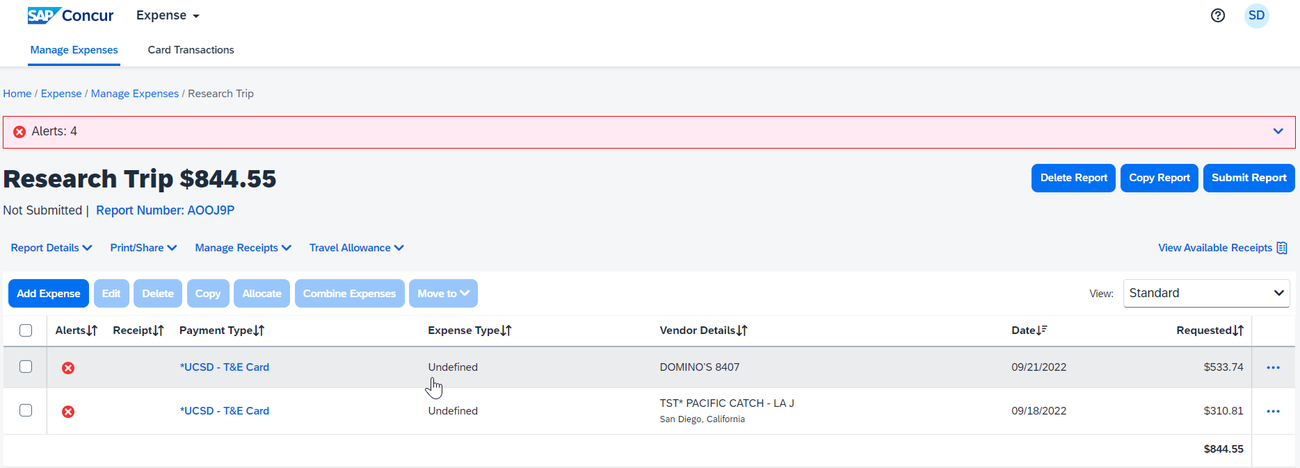 Once all the Expenses, manually entered, as well as any relevant Travel & Entertainment Card or UCSD CTS Air/Hotel Card Charges have been added, you are ready to Submit Report.