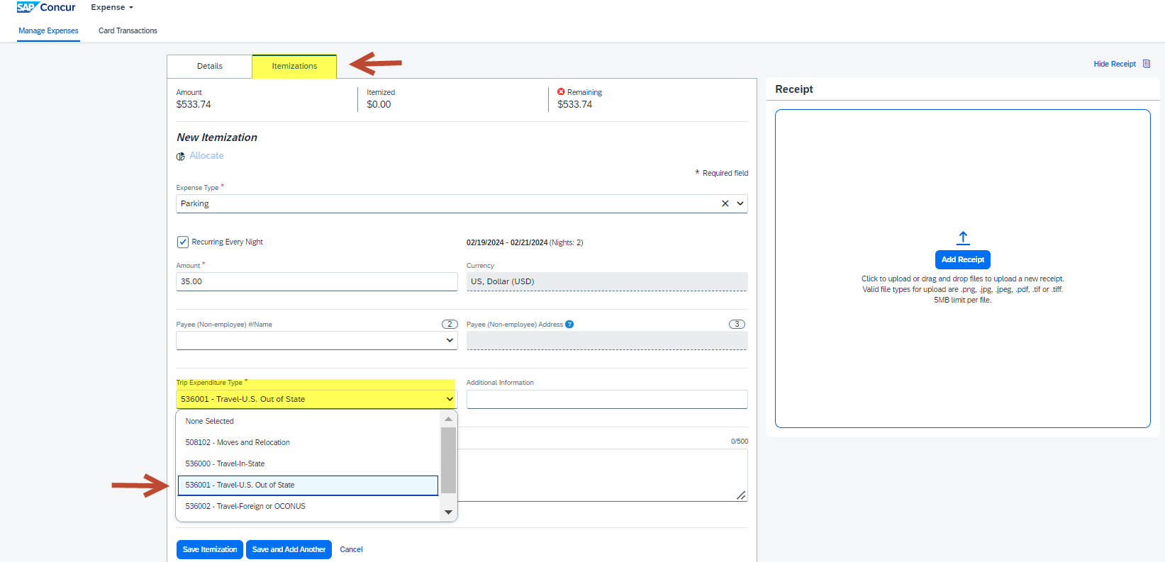 6. If Travel & Entertainment Card charges includes multiple types of Expenses (such as Hotel + Parking), create an itemization for each Expense Type in the charge by selecting the itemization tab.