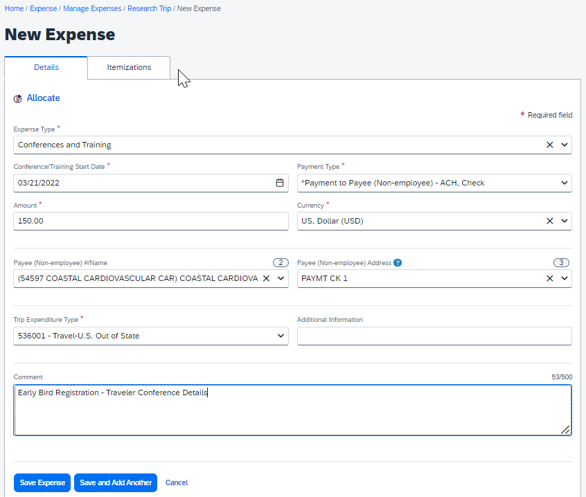 i. For more information on Allocation, review the KB0032337: How to Allocate Expenses in Concur.