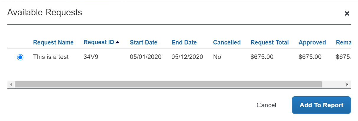 3. The list of your approved Requests will display, select the desired Request and select Add to Report.