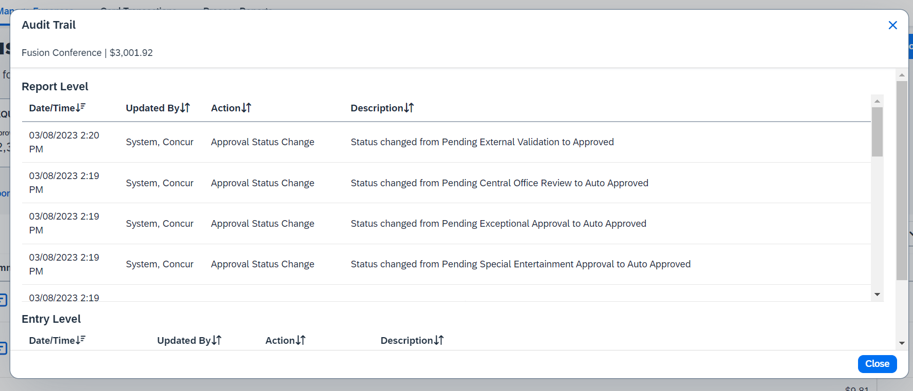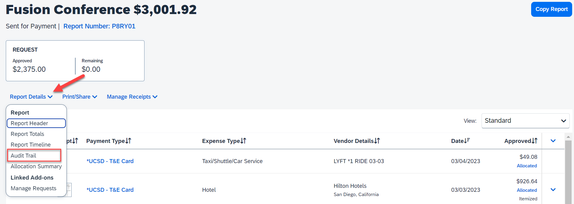 6. Select Report Details, then select Audit Trail from the drop-down menu, to view the detailed audit trail, which provides, Date/Time, Updated By, Action and Description.