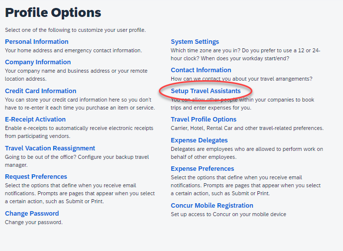 4. Click Setup Travel Assistants under Profile Options
