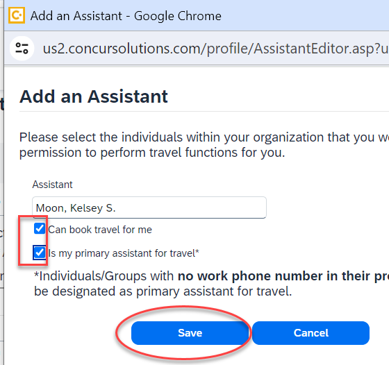 a. If desired, you may also add this person as your Primary Assistant by checking the second box: is my primary assistant for travel.