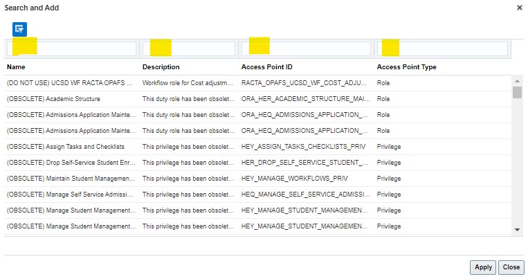 8. In the Search and Add dialog box, use one of the four text fields to search for the Access Points needed and select Apply to add them to the entitlement, select Close to close the window.