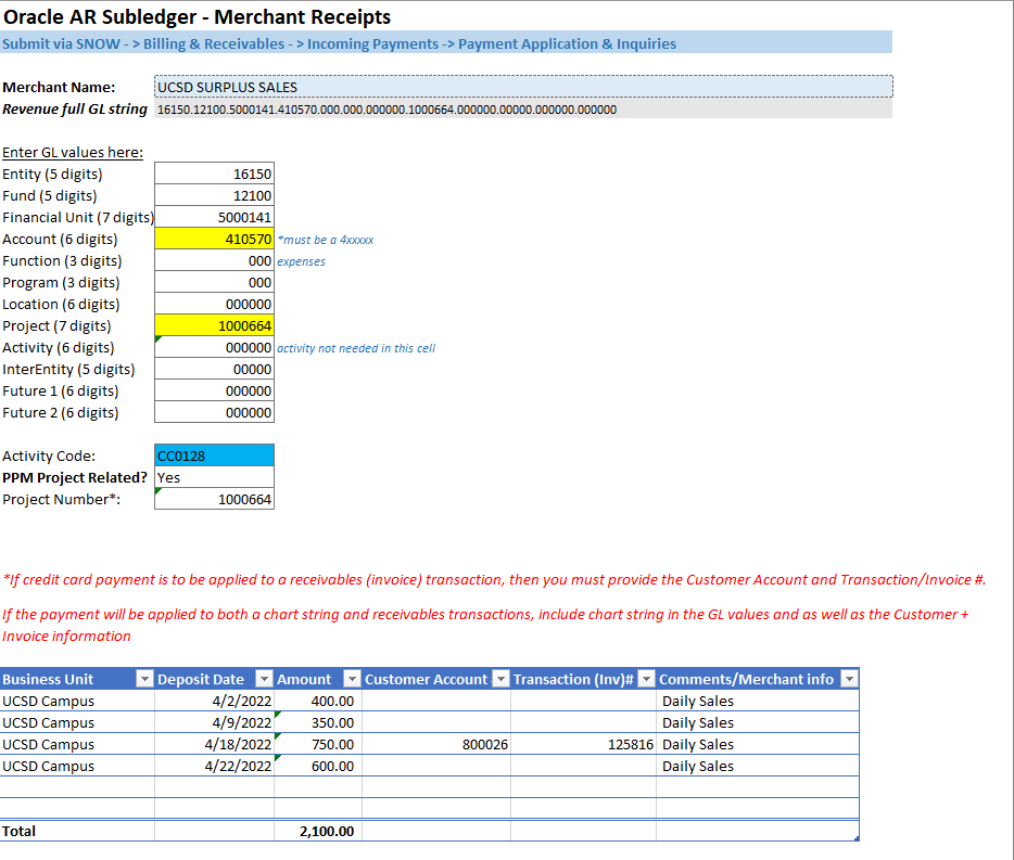 This article covers how to fill out the Merchant Receipt Template in Excel to clear the Oracle Credit Card Clearing Account Balance. Additionally, this article outlines how Departments and/or Financial Units, use the Merchant Receipt Template which accepts credit card payments through the credit card terminal or website. They are not invoicing in Oracle and need to book revenue to a Chart of Account (CoA).