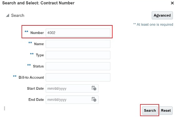 7. In Search and Select: Contract Number, enter the number for the desired Contract Number or Contract Number created in the Contract Exercise, e.g. 4002, then click Search.