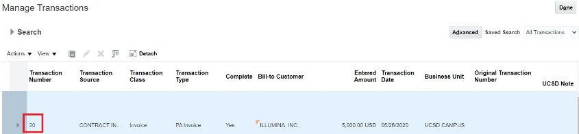 3. In Manage Transactions page, select transaction row and click on Transaction Number.