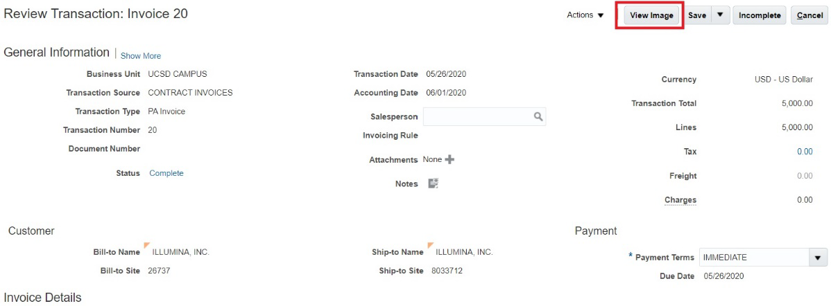 4. In Review Transaction: Invoice 20, click on View Image to download a PDF copy of the file generated.