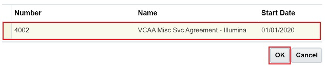 8. The Contract Name and Number should display at the bottom of the page, select row and click OK.
