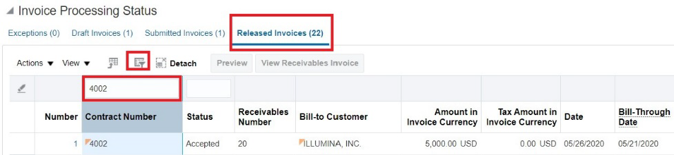 b. Click the filter button, in the Search field, enter the Contract Number.