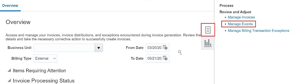 4. In Overview page, click on Task Panel Icon on the right side, in Review and Adjust, click Manage Events.