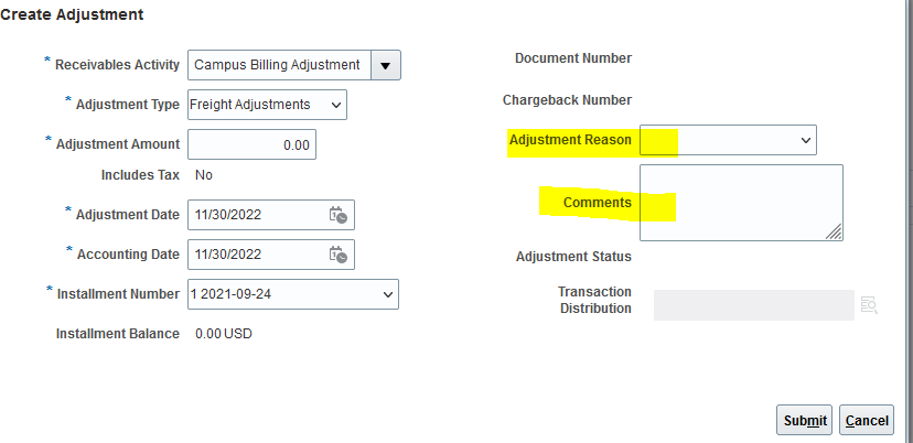 9. Provide an Adjustment Reason and Comments, then Submit. The Adjustment will route for approval to the AR Team.
